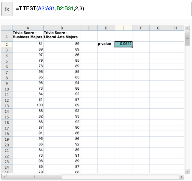 The p-value of the two-sided hypothesis test is T.TEST(array1, array2, tails, type)=T.TEST(A2:A31,B2:B31,2,3), which is approximately 0.0524. You must designate this test as a two-sided test (that is, assign the value 2 to the tails argument) and as a type 3 test (an unpaired test with unequal variances) because you are testing two different samples. You must link directly to values in order to obtain the correct answer.