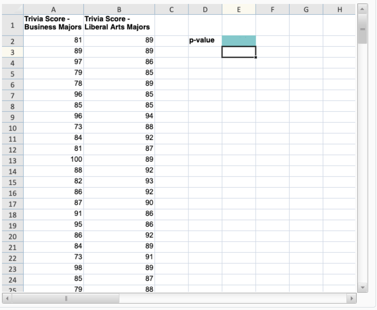 A college student is interested in testing whether business majors or liberal arts majors are better at trivia. The student gives a trivia quiz to a random sample of 30 business school majors and finds the sample’s average score is 86. He gives the same quiz to 30 randomly selected liberal arts majors and finds the sample’s average score is 89. Using the data provided below, calculate the p-value for the following hypothesis test: