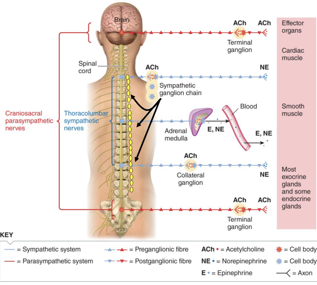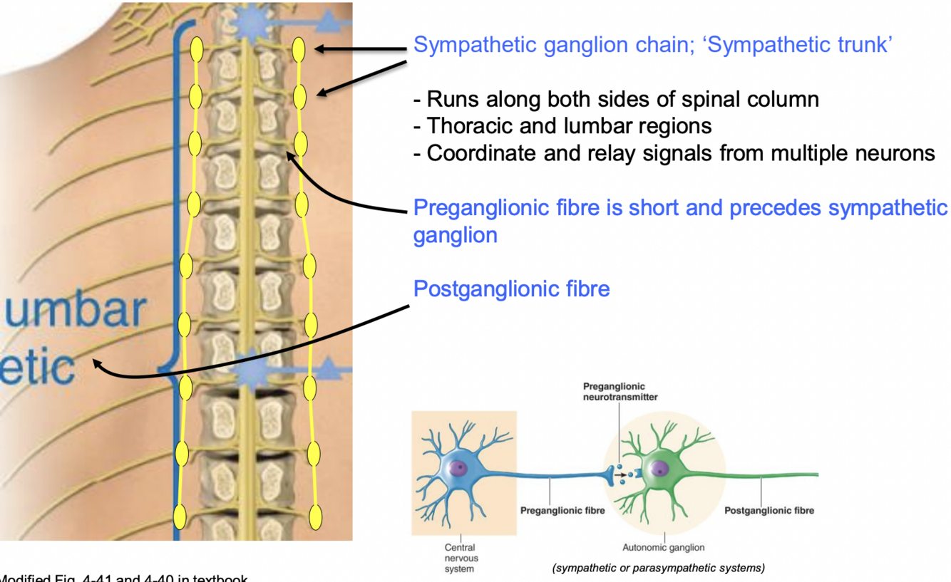 preganglionic fibres are short and precede the sympathetic ganglion chain