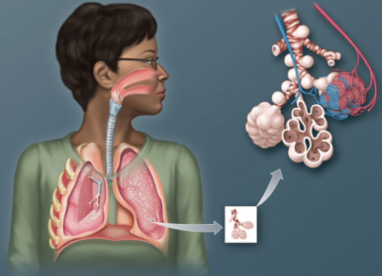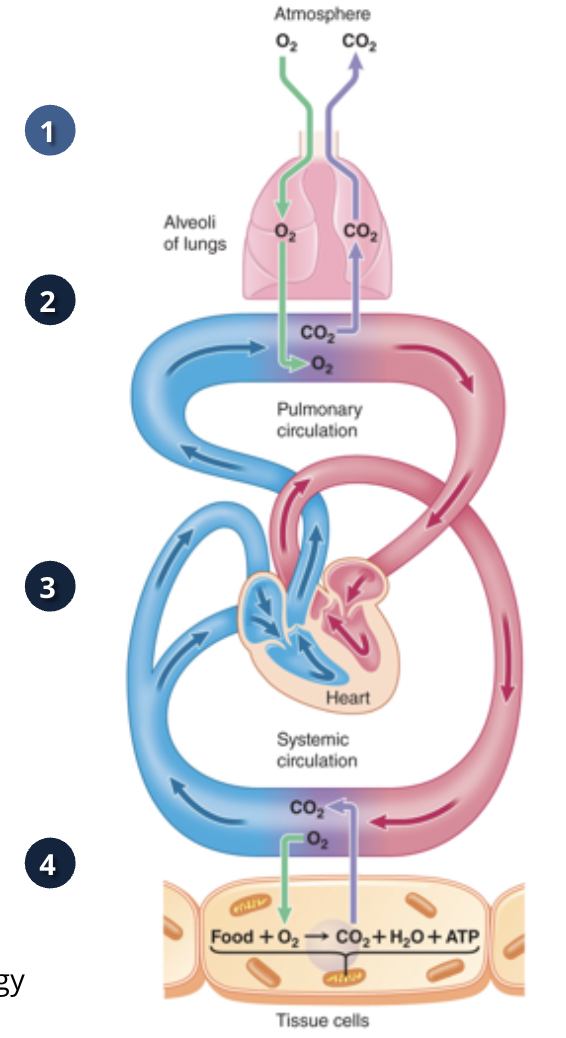 involves all of the processes that bring oxygen from the atmosphere into the body, the transport of O2 to the tissues, and the removal of CO2 from the tissues and its release back into the atmosphere