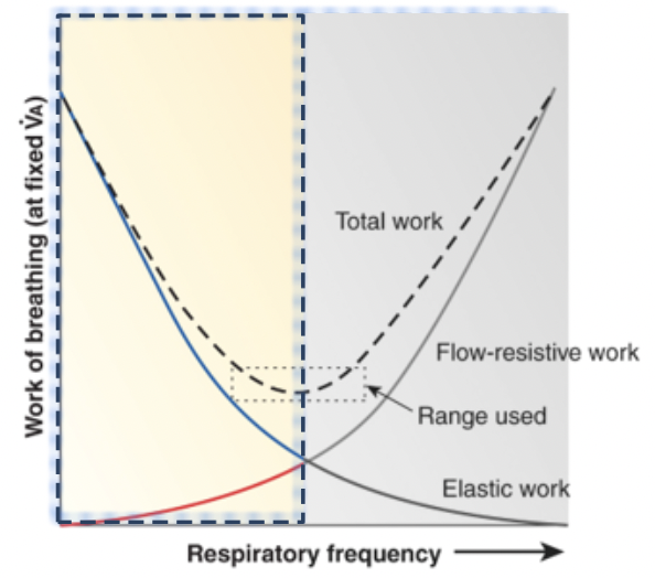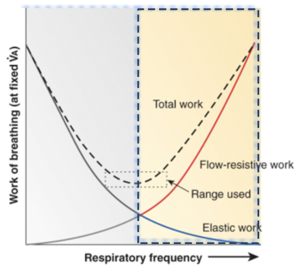 when we increase respiratory rates, the tidal volume can decrease, which reduces the elastic work of the lung, but because you are moving more air, the flow-resistance work of the lung increases