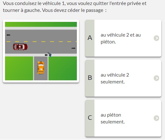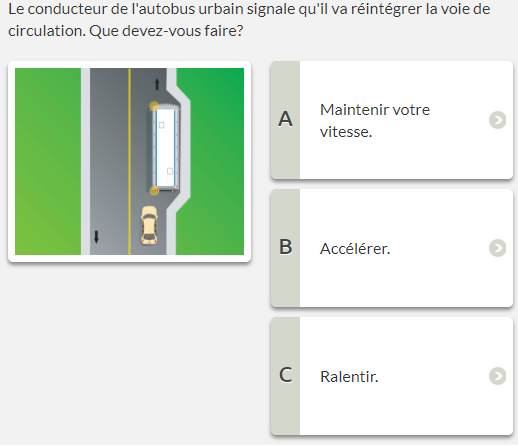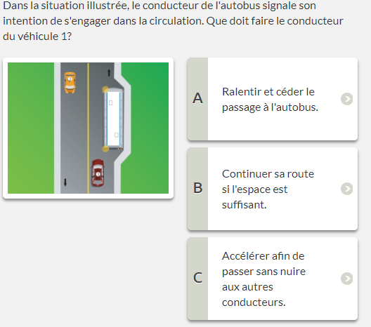Dans la situation illustrée, l’autobus scolaire est arrêté. Ses feux intermittents sont en marche. Que doit faire le conducteur du véhicule?