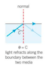 The angle of incidence at the boundary between 2 media that will produce an angle of refraction of 90°