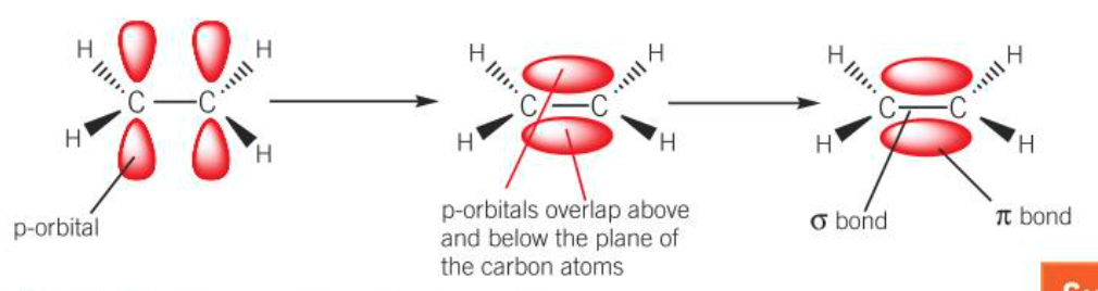 For each carbon atom of the double bond, 3 of the 4 valence electrons are used to form sigma bonds (σ bonds). This leaves 1 electron on each carbon atom not involved in σ bonds. This electron is found in an unhybdridised p orbital. A pi bond (π bond) forms from the sideways overlap of 2 p-orbitals, one from each carbon of the double bond.