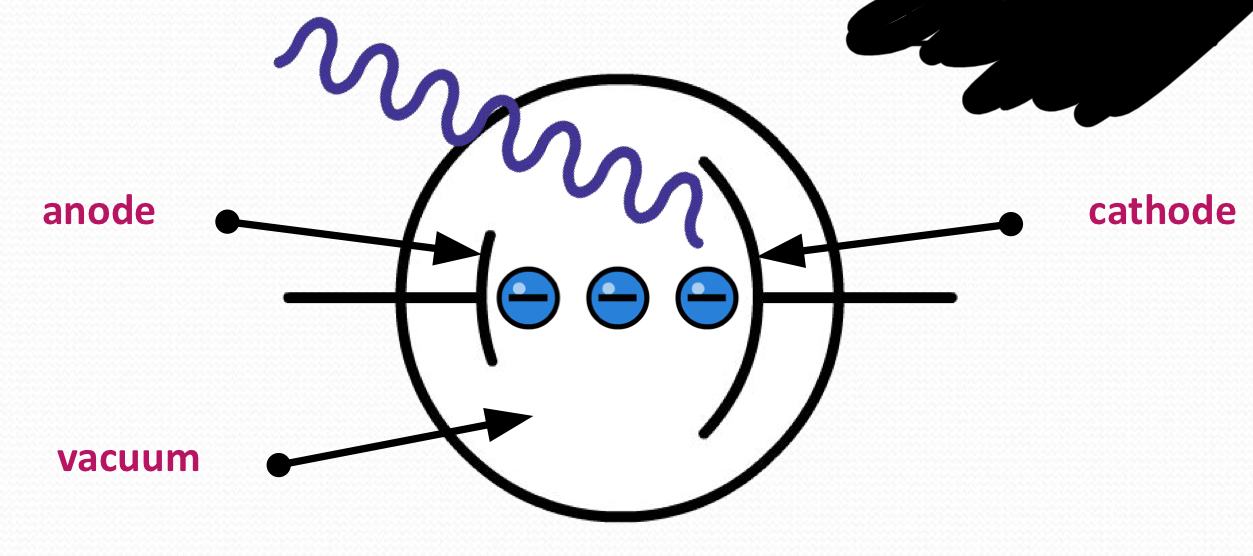 A photocell contains a separated cathode and anode within a vacuum, when light is shone onto the cathode of the photocell, electrons are released and attracted to the anode, causing current to flow. This is due to the photoelectric effect