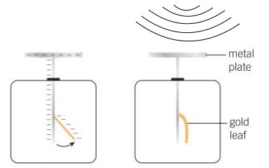 If you briefly touch the top plate with a negative elctrode from a high-voltage power supply, the electroscope will be charged with excess electrons deposited on the palte stem, and gold leaf. This will cause the stem and leaf to repel each other as they are both engatively charged. If you then shine UV radiation onto the top plate, then the gold leaf will fall back towards the stem as the incident radiation allows the free electrons to be emitted from the metal through the photoelectric effect. Therefore the stem and leaf no longer repel each other as they are not like charged
