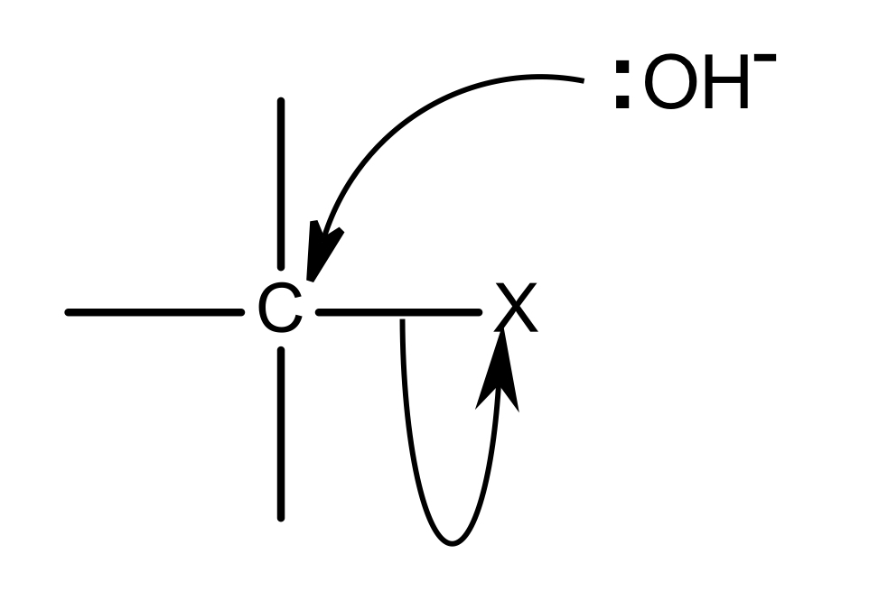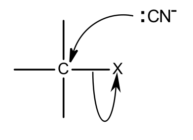 The nucleophile has a lone pair of electrons and the carbon-halogen bond is polar. The electrons in the lone pair move to form a bond with the slightly positive carbon atom. However, carbon is restricted to 8 electrons in its outer shell so the polar carbon halogen bond breaks heterolytically forming a negative halide ion (the leaving group).