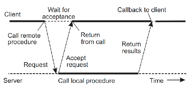 <br></br>Asynchronous RPC: The client resumes executing as soon as the server acknowledges the receipt of the request. There is a callback function that is called by the server to return the result back to the client.</p>