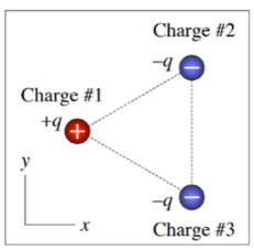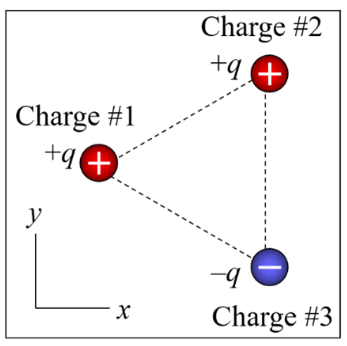 If the three-point charges shown here lie at the vertices of an equilateral triangle, the electric potential at the center of the triangle is