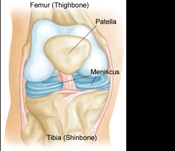 A meniscus is a tough, rubbery, C-shaped piece of fibrocartilage that acts as a shock absorber and stabilizer between the thighbone (femur) and shinbone (tibia) in the knee