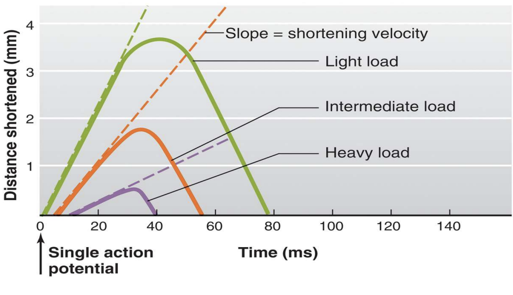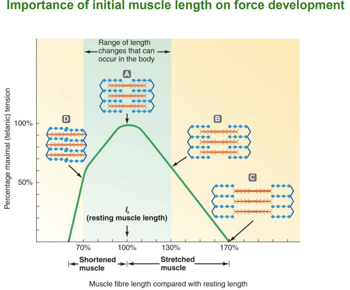 The length of the muscle starting at a very stretched position means that the myosin and actin are not lined up so there won’t be as much contraction occuring