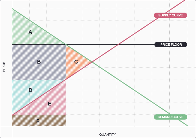The graph below depicts a price floor on the sale of electrician services. Which region or regions represent producer revenues?