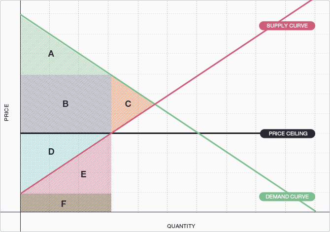 C is deadweight loss and represents surplus that would have been created in equilibrium but was not due to the price ceiling.