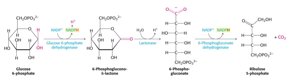 In the first part, the oxidative phase, glucose-6-P is oxidized and in the process, NADP+ gets reduced to NADPH.
