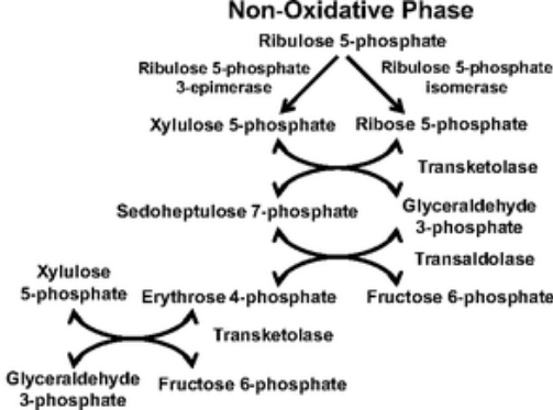 These two molecules can then be used by the non-oxidative portion of the PPP, using the reversible reactions catalyzed by transketolase and transaldolase, to produce ribose-5-P