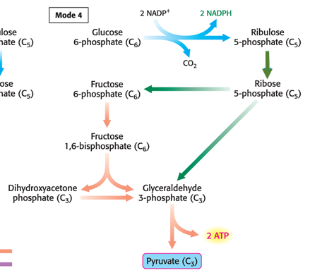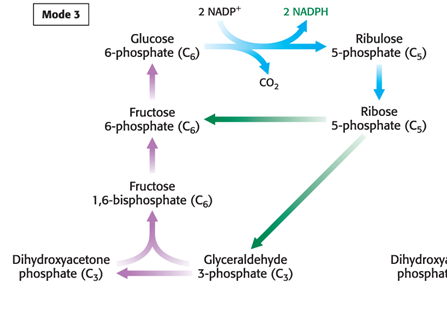 If one writes out the stoichiometry of all three of these reaction sets, one finds that every glucose-6-P is oxidized to 6CO2 with 12 NADPH produced.