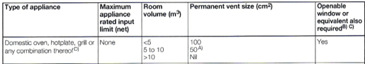 The ventilation requirement for a domestic oven, in a room 5 to 10m3, is 50cm2.