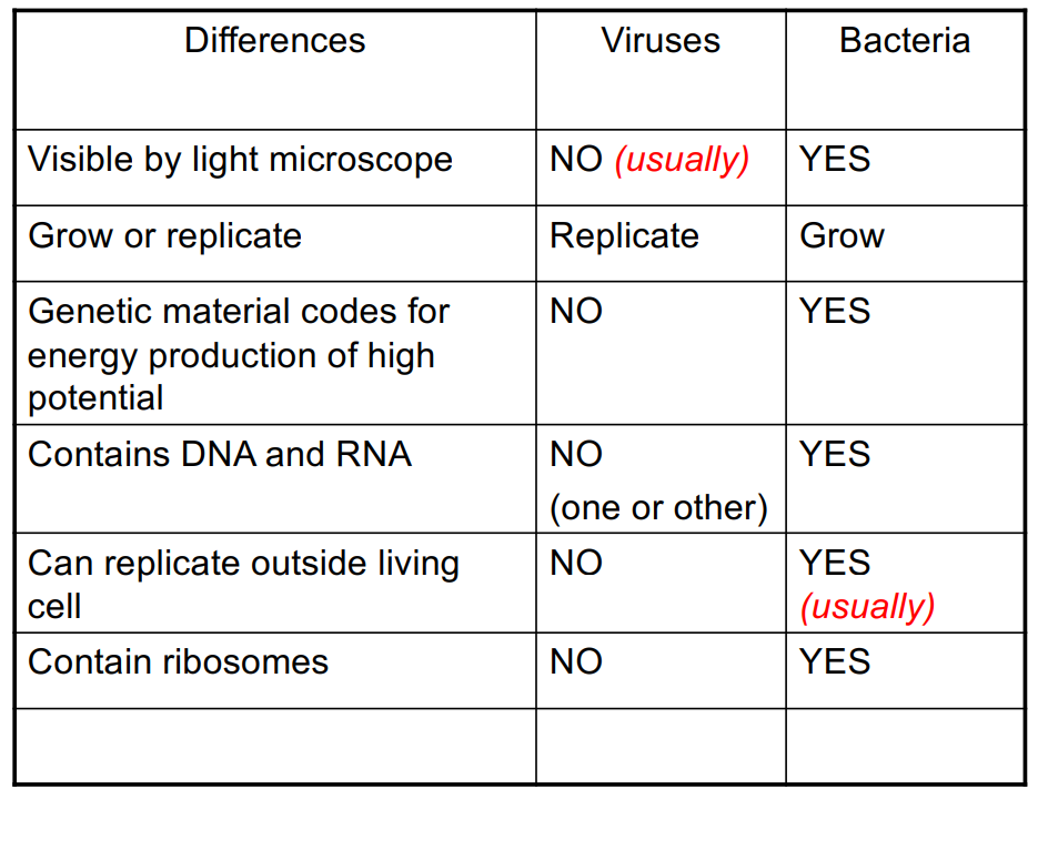 Visibility: Viruses are not usually visible by light microscopy, whereas bacteria are visible.