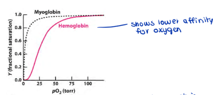 -the amount of O2 required to half saturate the protein is quantified by P50 (P50 of myo is 3 torr)
