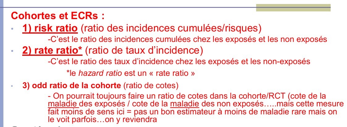 Rappel - définition du risk ratio, rate ratio et odd ratio