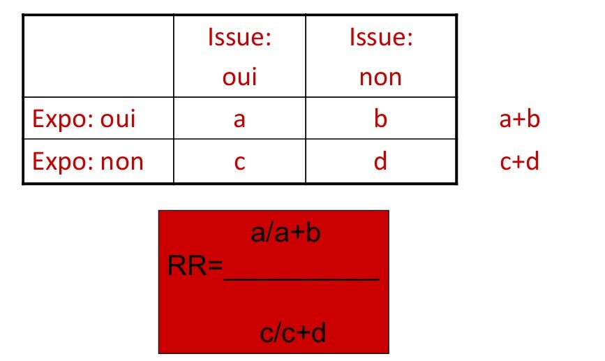 RR = (nb exposés et malades / nb exposés total)/(nb contrôles malades / nb contrôles)