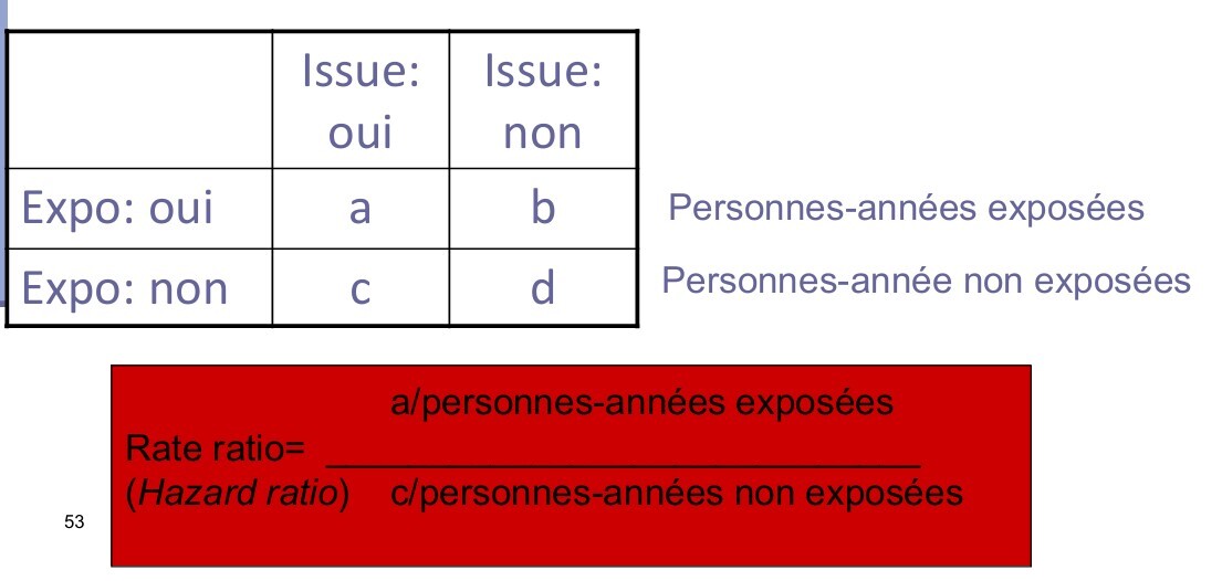 Rate Ratio : ratio des taux d’incidence (aka hazard ratio): ratio des taux d’incidence chez les exposés et les non-exposés