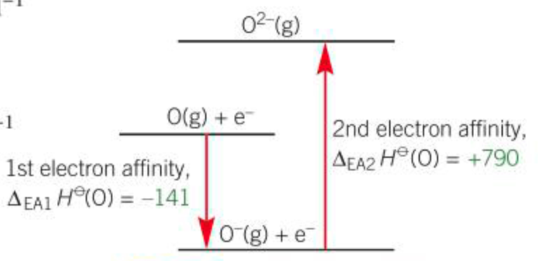 First electron affinity is exothermic, however second electron affinity (and all subsequent electron affinitys) are endothermic. This is because the second electron is being gained by a negative anion which repels the electron away. Therefore, energy must be put in to force the negatively-charged electron onto the negative ion