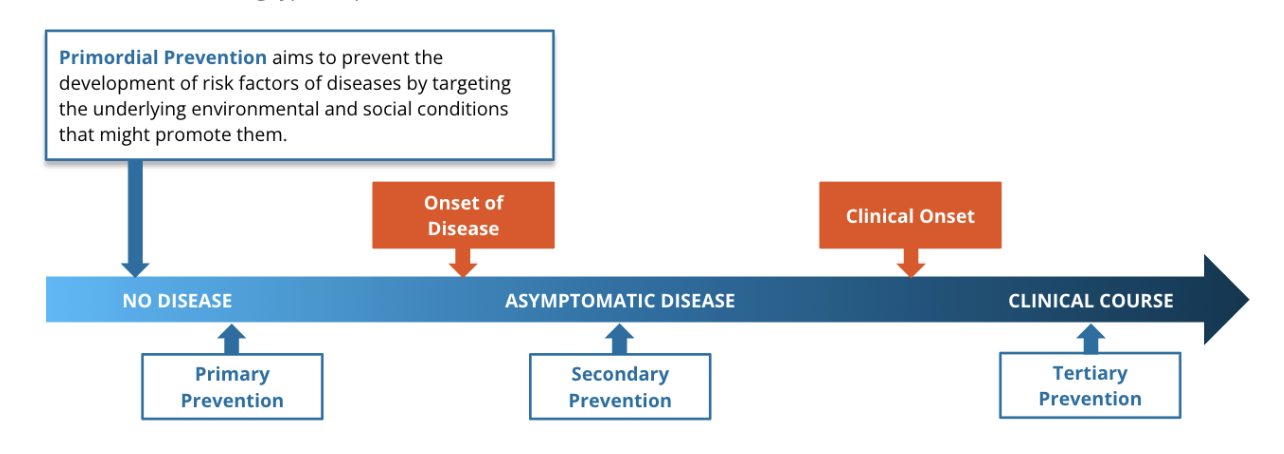 Primordial prevention is often considered synonymous with health promotion; however, by strict definitions, that is not entirely accurate. Primordial prevention consists of risk factor prevention/reduction through social and environmental changes for the entire population. These changes tend to be accomplished through policy and law changes. In addition to the aforementioned, health promotion helps individuals increase their control over their health, by promoting skill development and healthy habits. Thus, health promotion is a comprehensive approach to helping people obtain their maximum achievable health status.