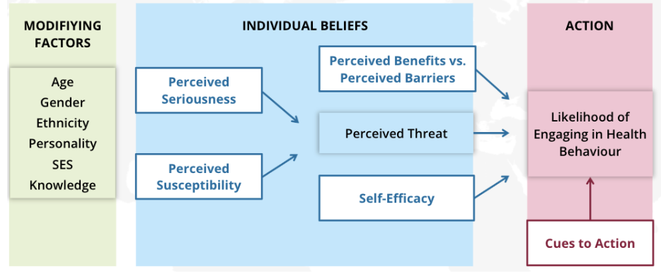 The Health Belief Model is a social psychological model developed to both predict and explain health behaviours. The model suggests that an individual’s beliefs about various facets of a potential health problem or disease can impact and explain their health related behaviours