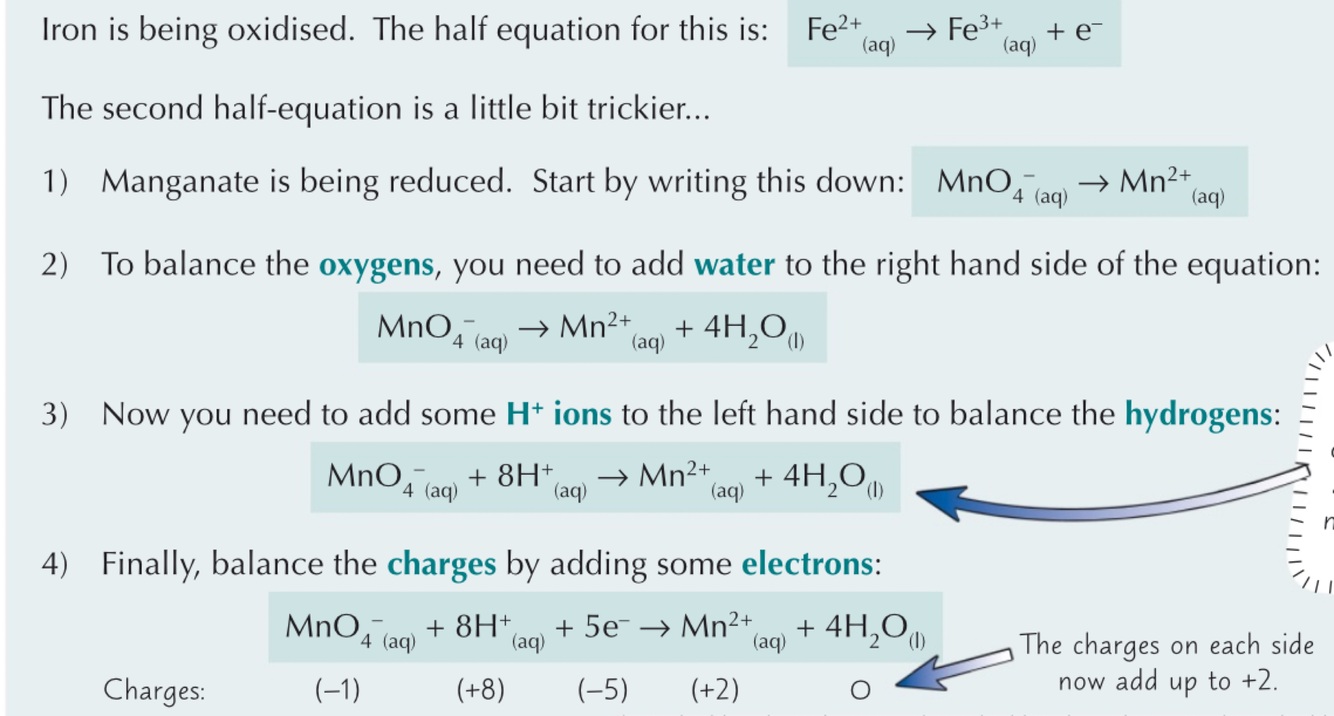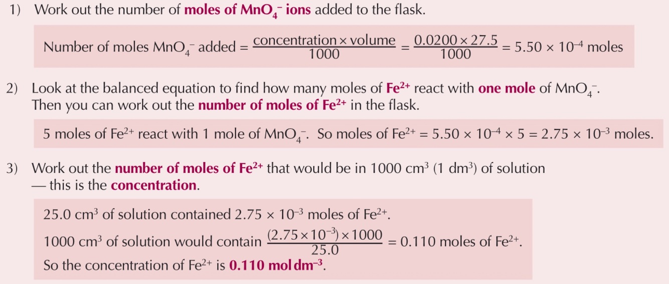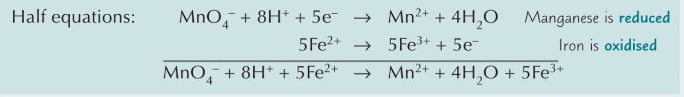 Stop when the mixture in the flask just becomes tainted with the colour of the MnO4 - (end point) and record volume of oxidising agent added