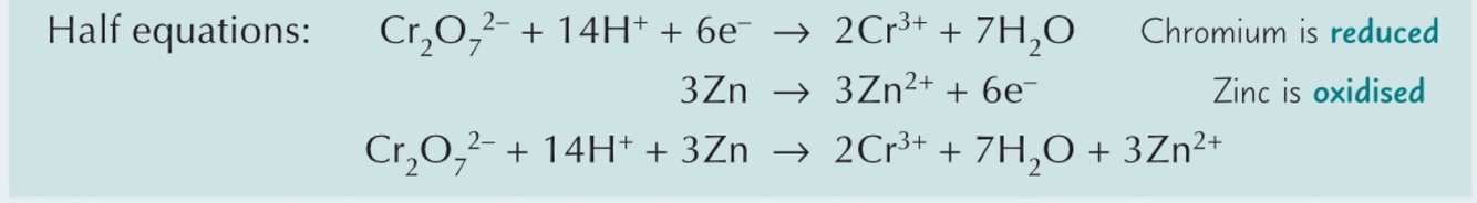Contains dichromate(VI) ions (Cr2O7 2-) in which chromium has an oxidation state of +6
