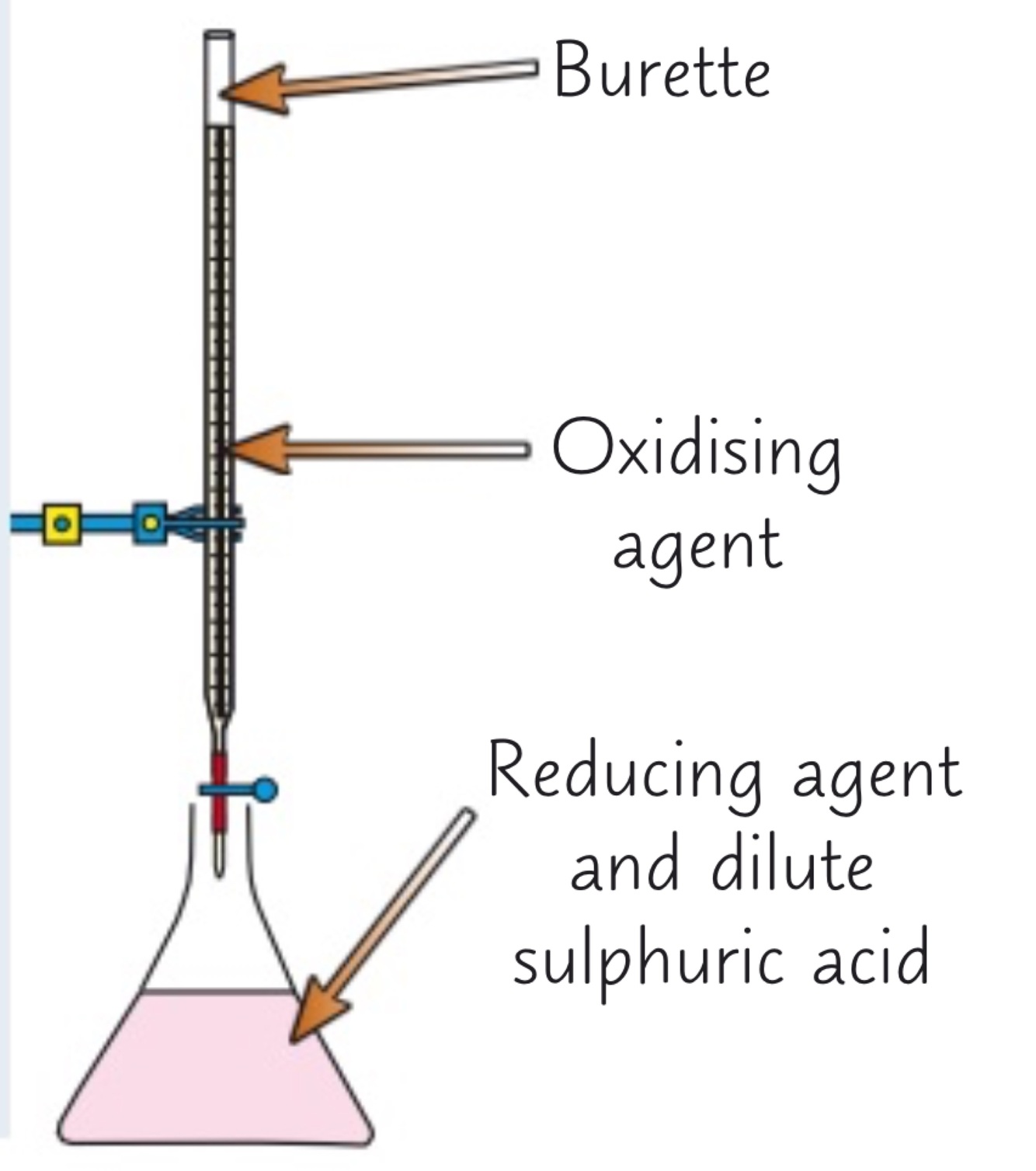 Add dilute sulfuric acid to the flask (this is an excess to make sure there are enough H+ to allow oxidising agent to be reduced)