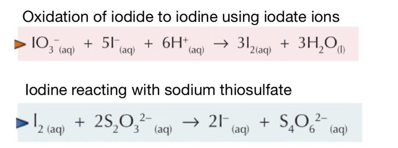 Use a sample of oxidising agent to oxidise as much iodide as possible by measuring out 25cm3 of potassium iodate solution (KIO3 and oxidising agent)