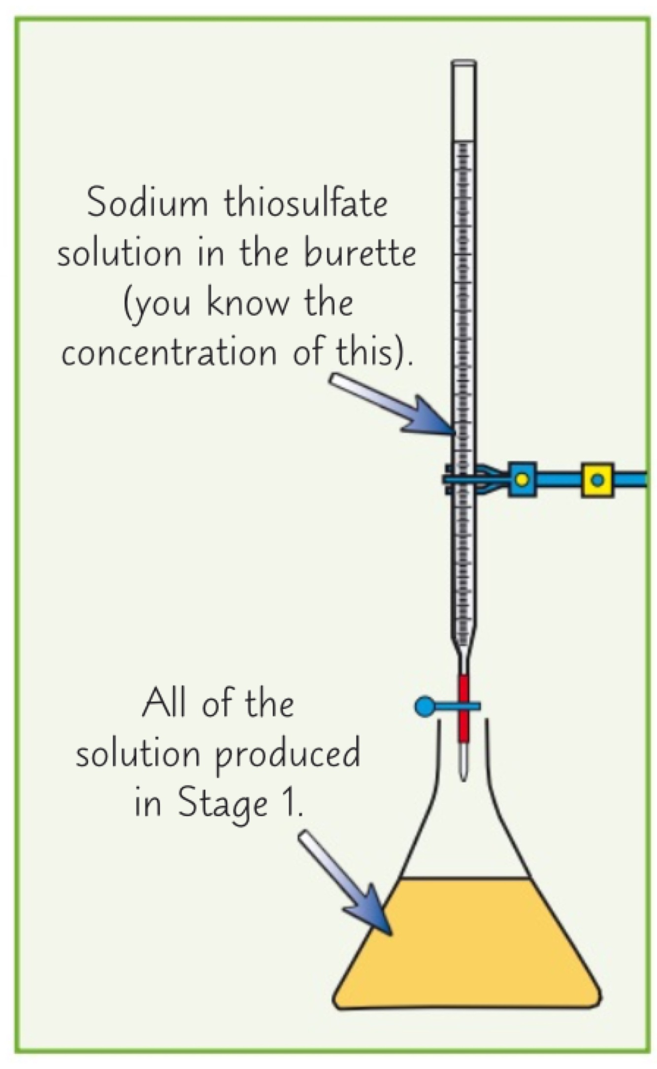 Add sodium thiosulfate one drop at a time until blue colour disappears