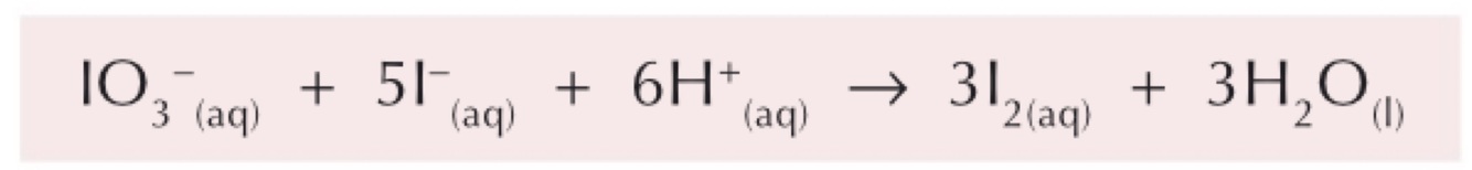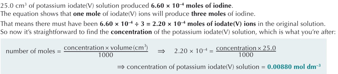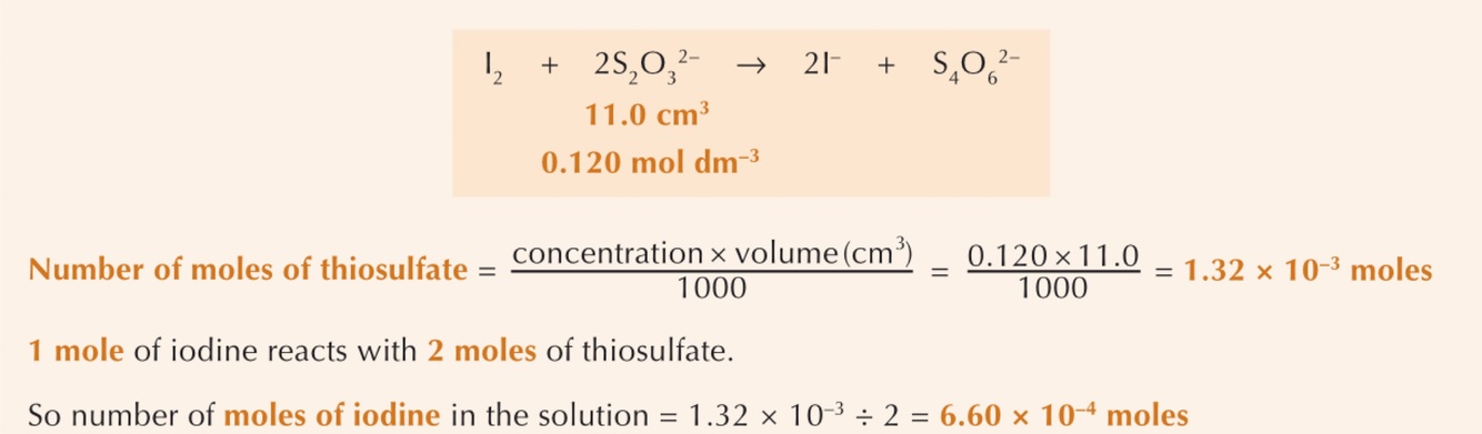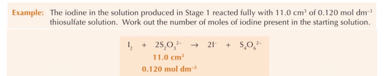 Then find out how many moles of iodine have been produced by titrations the solution with a known conc of sodium thiosulfate (Na2S2O3)