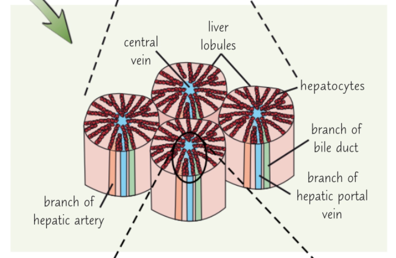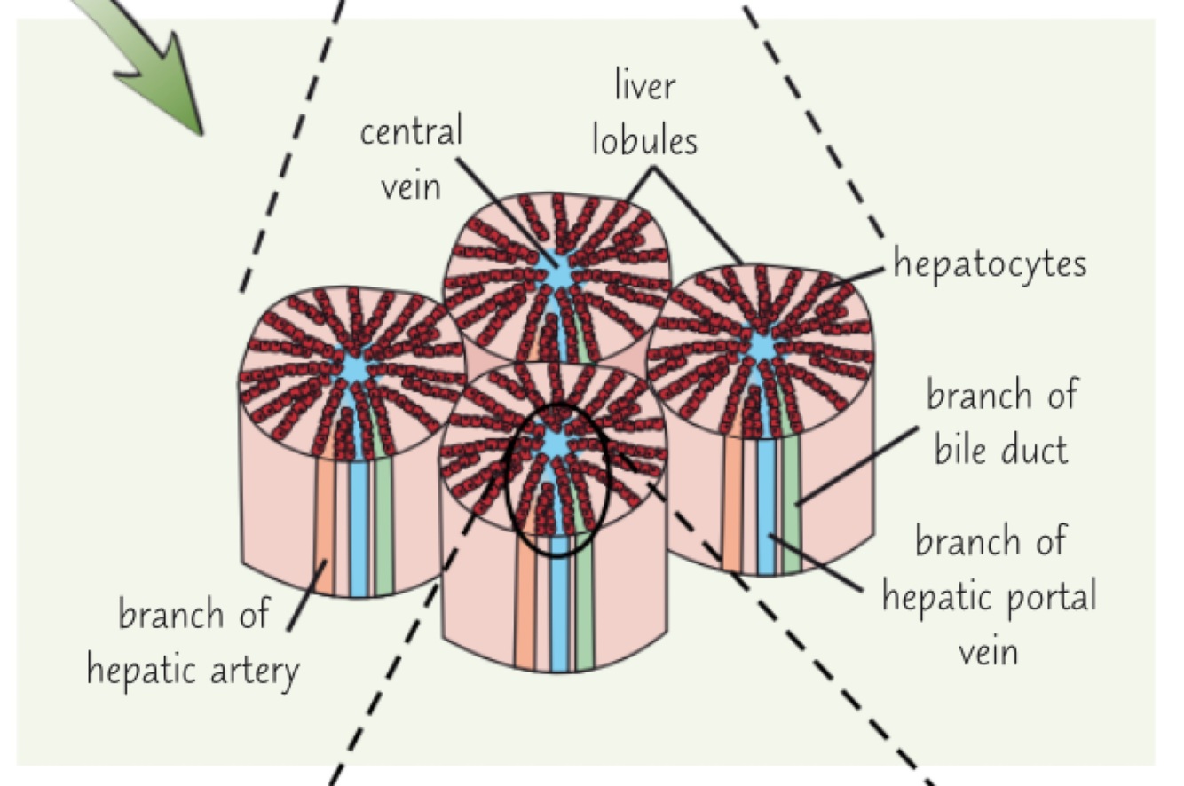 Each lobule has a central vein in the middle which connects to the hepatic vein