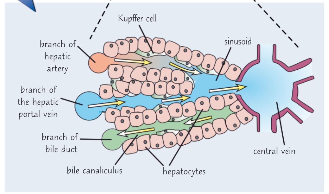 Blood runs to the central vein in each sinusoid