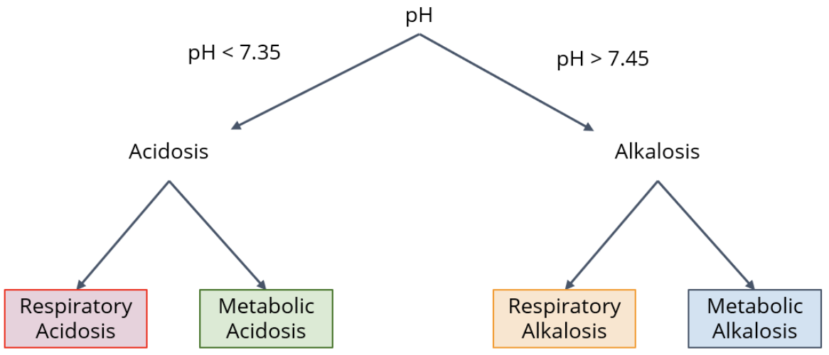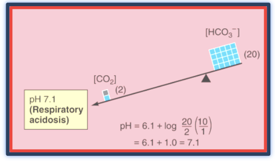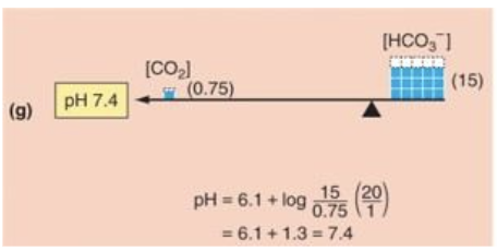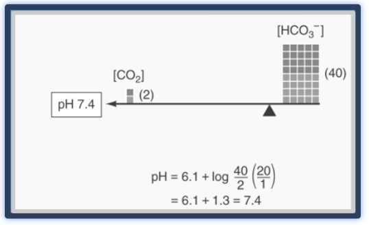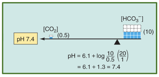 - when the ratio rises above 20:1 this will cause alkalosis as the pH will be greater than 7.4