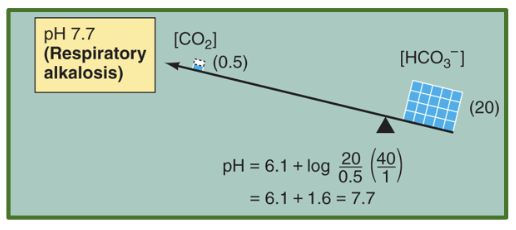 the decrease in [CO2] increase the [HCO3-]:[CO2] ratio (since there is little change in [HCO3-]), thus resulting in an increased pH