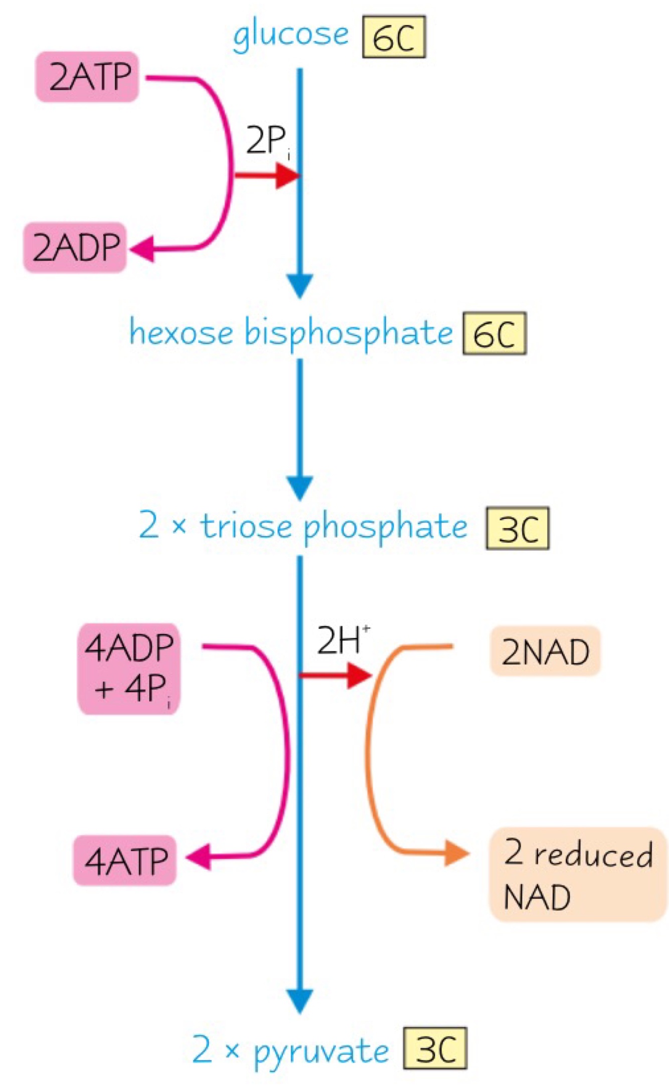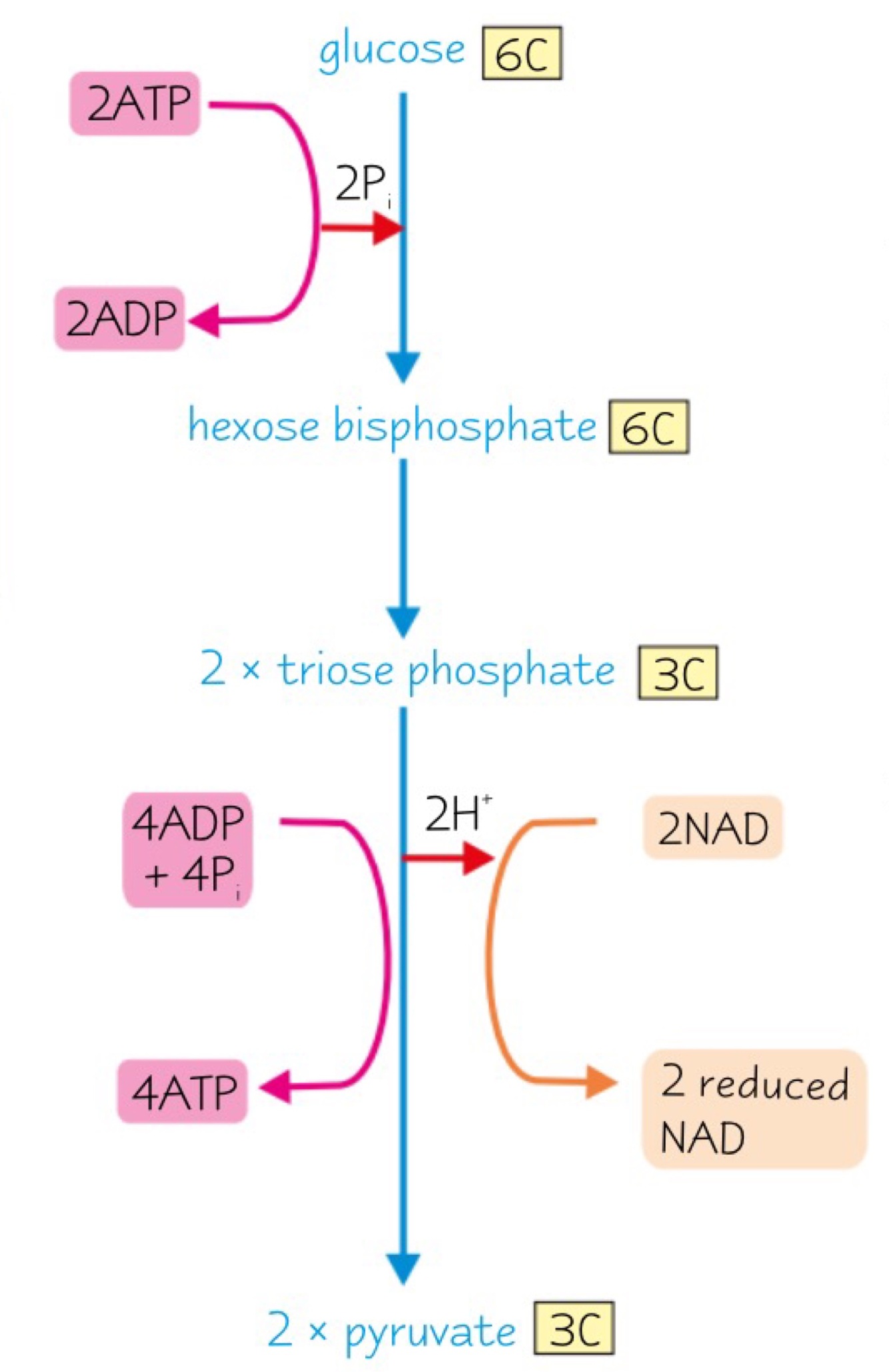 Triose phosphate is oxidised (loses hydrogen), forming 2 molecules of pyruvate.