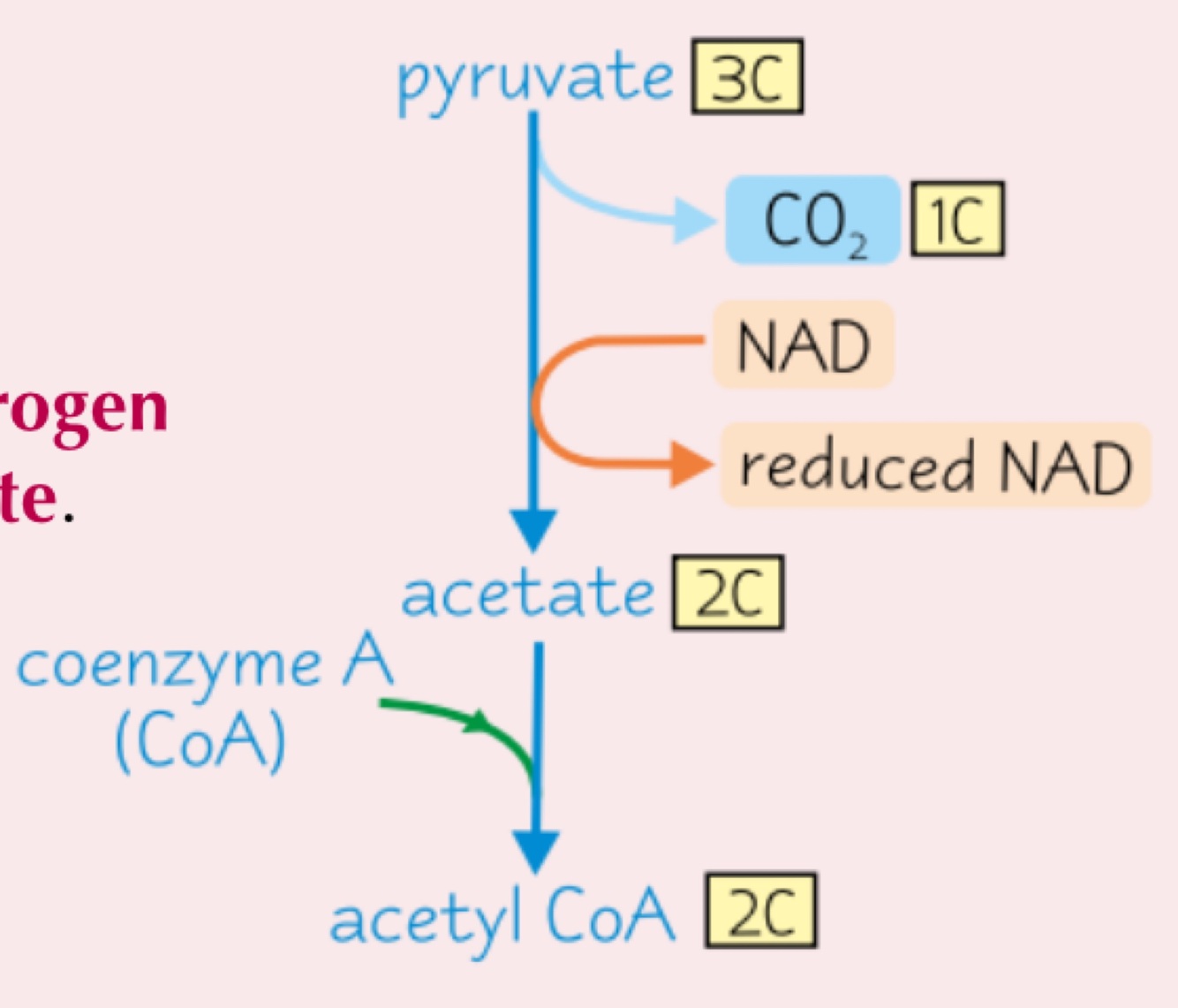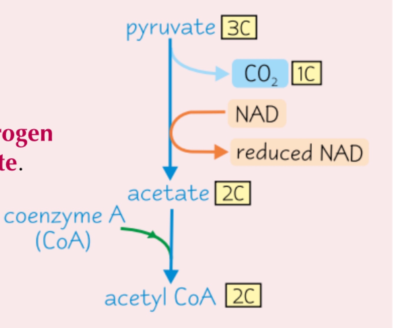 Pyruvate is decarboxylated removing a single carbon as CO2