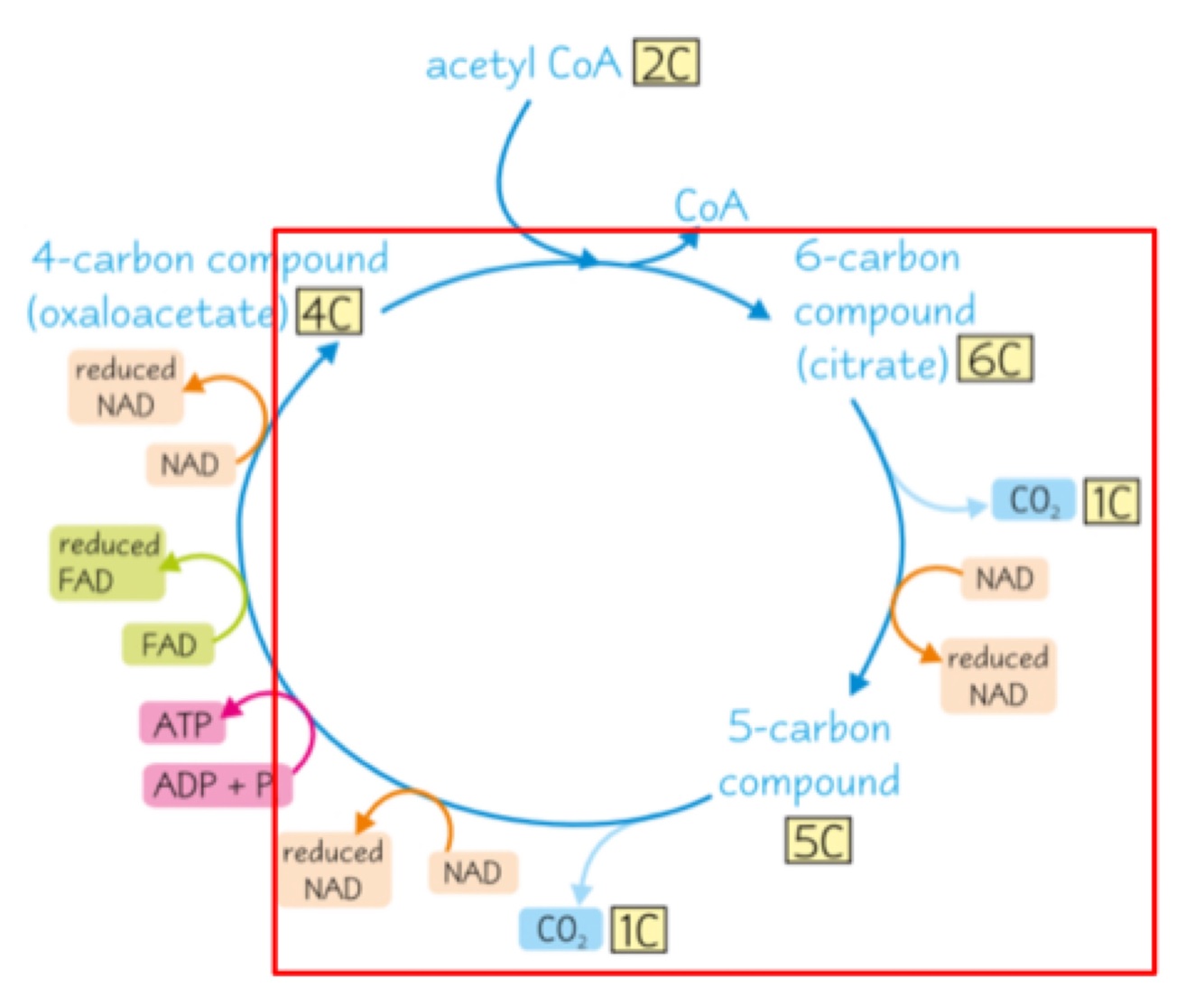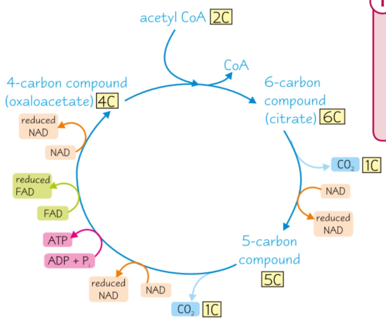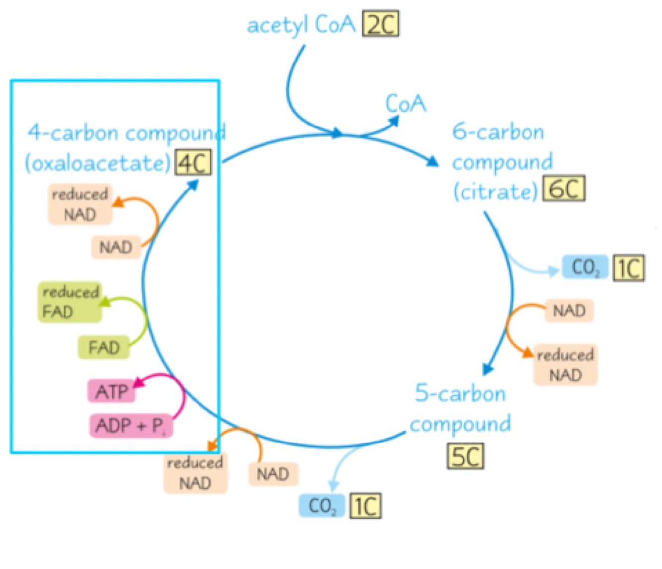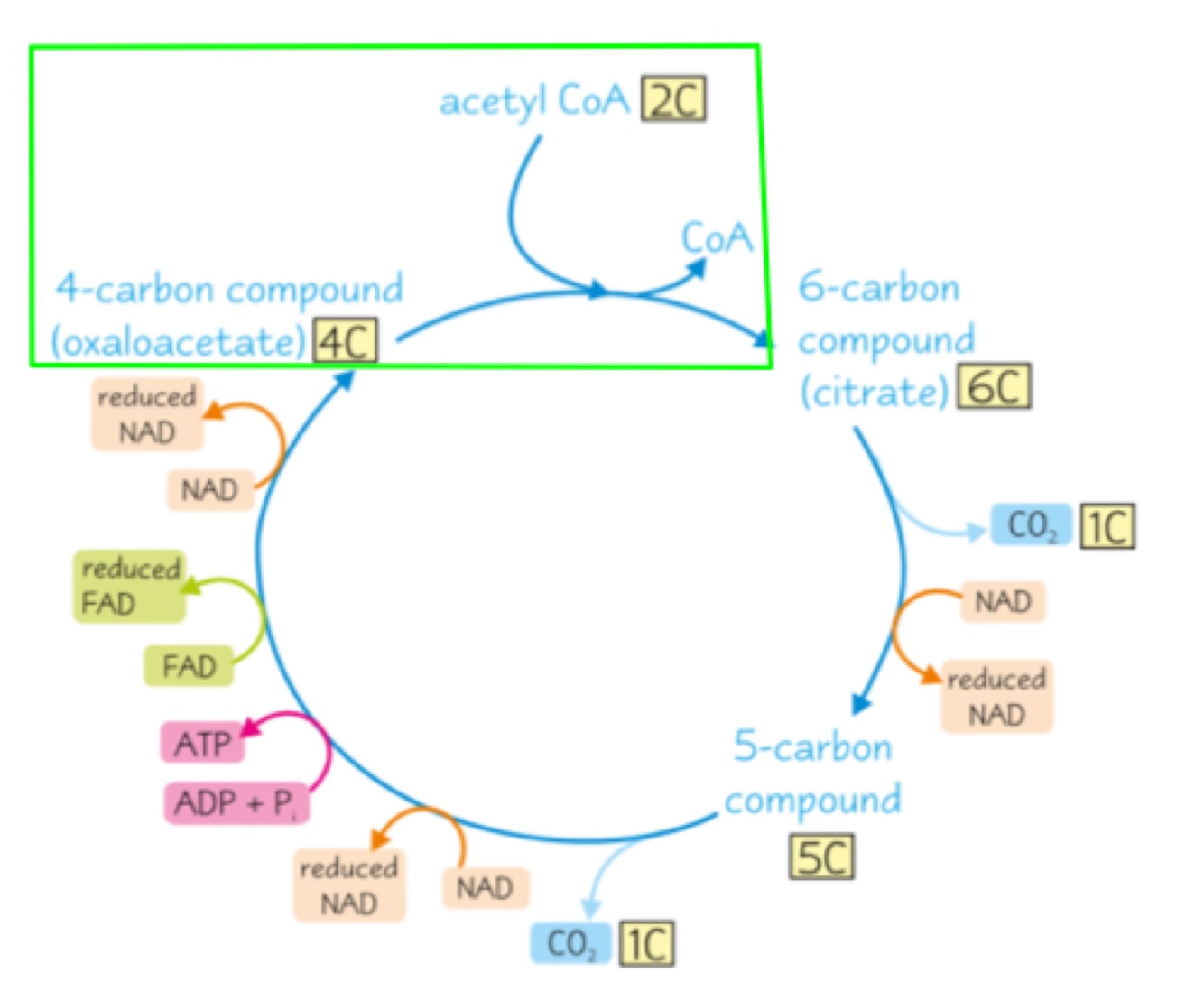 Acetyl group from acetyl CoA (produced in link reaction) combines with oxaloacetate to form citrate (citric acid) which is a 6C compound