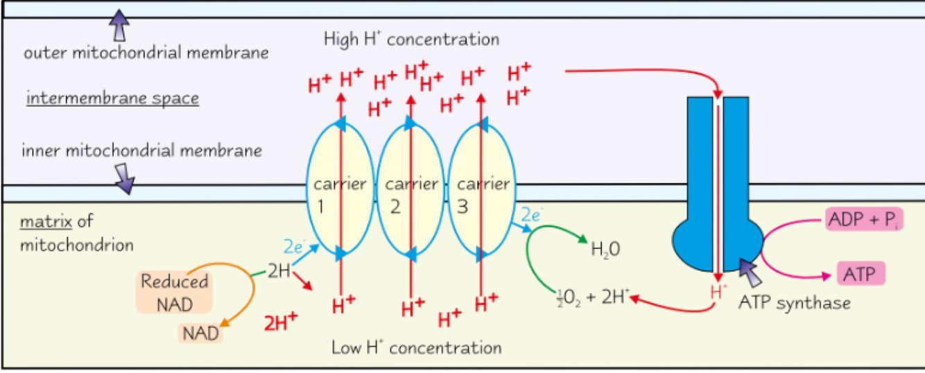This process of ATP production driven by the movement of H+ ions across a membrane (due to electrons moving down an electron transport chain) is called chemiosmosis