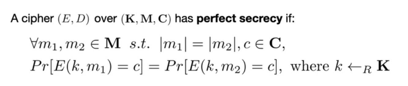 For all messages m1, m2 in the message space that are the same size and all ciphertexts c in the ciphertext space: the probability that the encryption of m1 to ciphertext c is the same as the probability that the encryption of m2 to ciphertext c, where the key k i selected uniformly at random