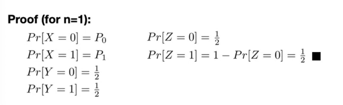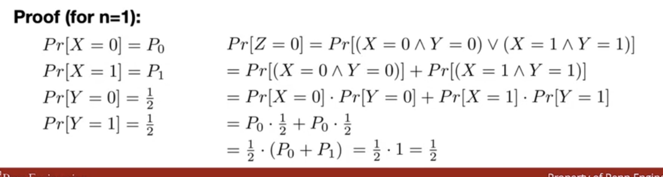 Lemma: If X is a random variable on {0,1}^n and Y is an independent uniform random variable on {0,1}^2 then Z=X XOR Y is a uniform random variable on {0,1}^n
