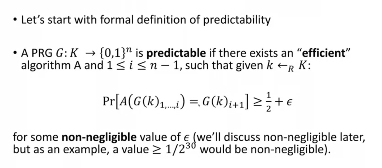 informally: a PRG is predictable if there exists an integer i and an efficient algorithm A such that the given the prefix of the output an algorithm can predict the rest