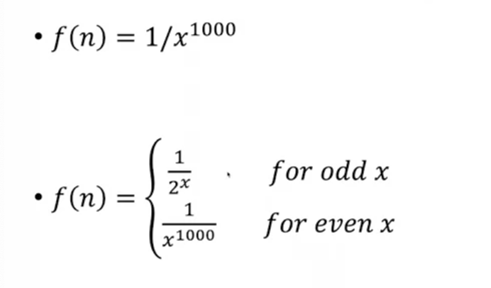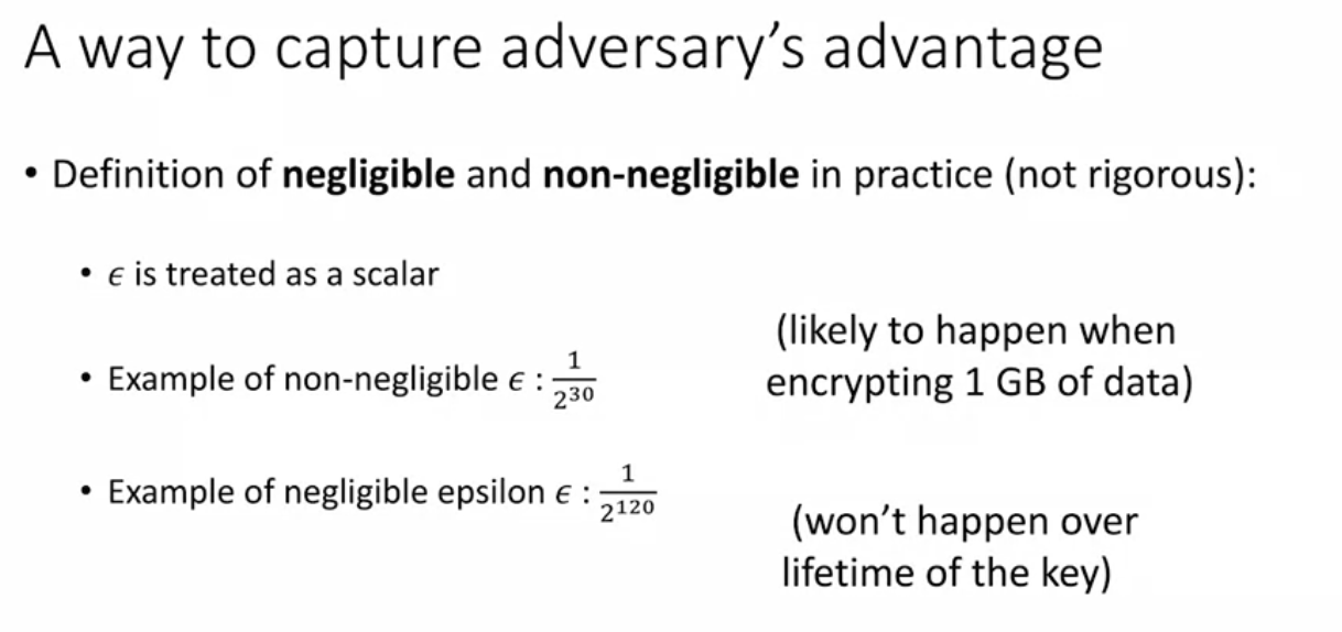 examples of negligible functions: 1/2^n, 1/2^sqrt n, 1/n^log(n)