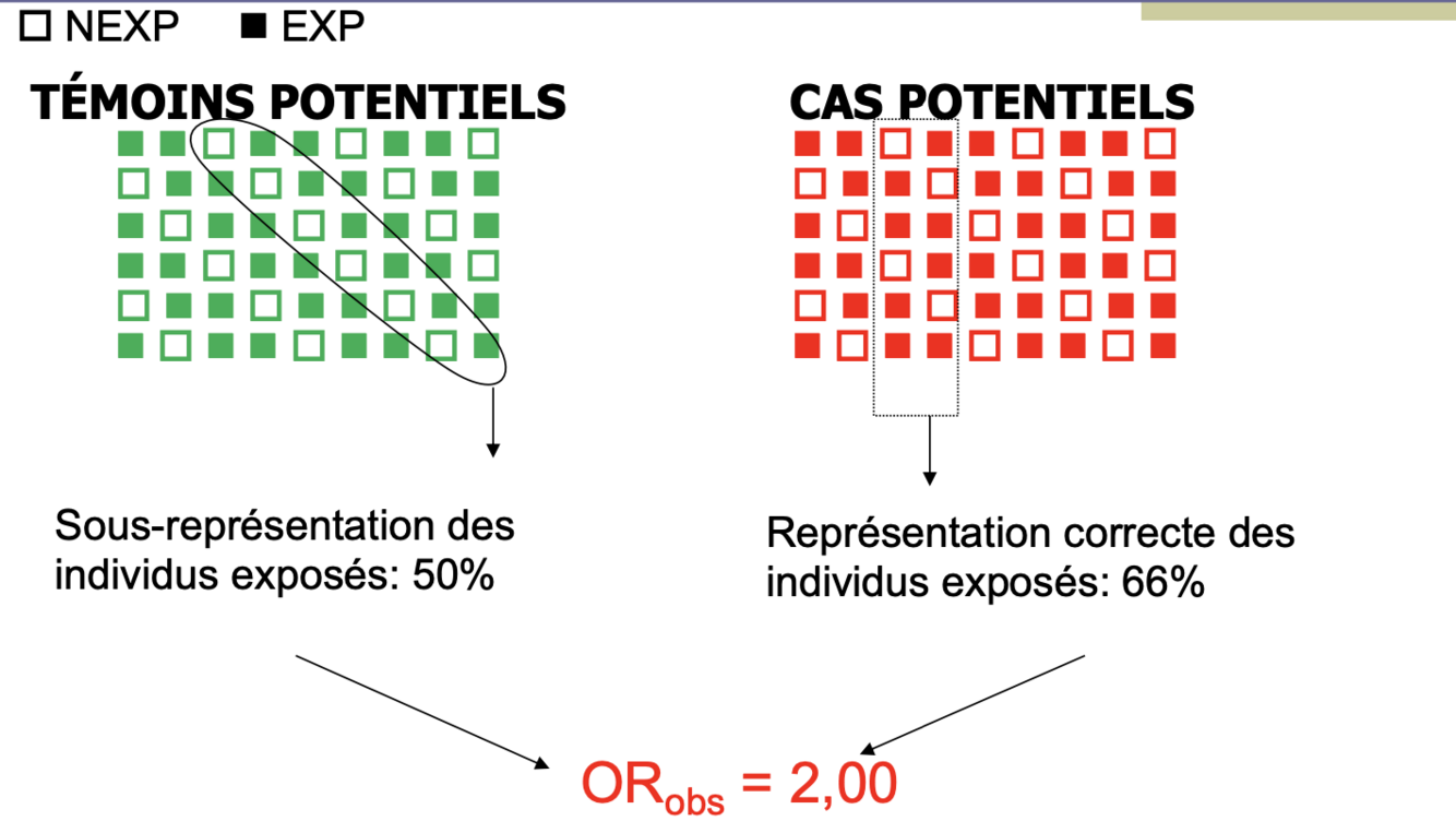 Biais lié au choix du groupe témoin: L’exposition des témoins choisis n’est pas représentative de celle de l’ensemble des témoins potentiels –>Ex: Café et cancer du pancréas (sujets hospitalisés)