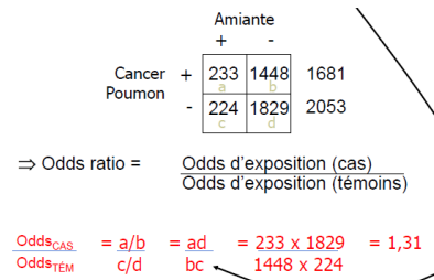 Il s’agit d’un rapport d’inégalité des expositions entre cas et témoins. On le calcule à partir des “odds” (cotes) :