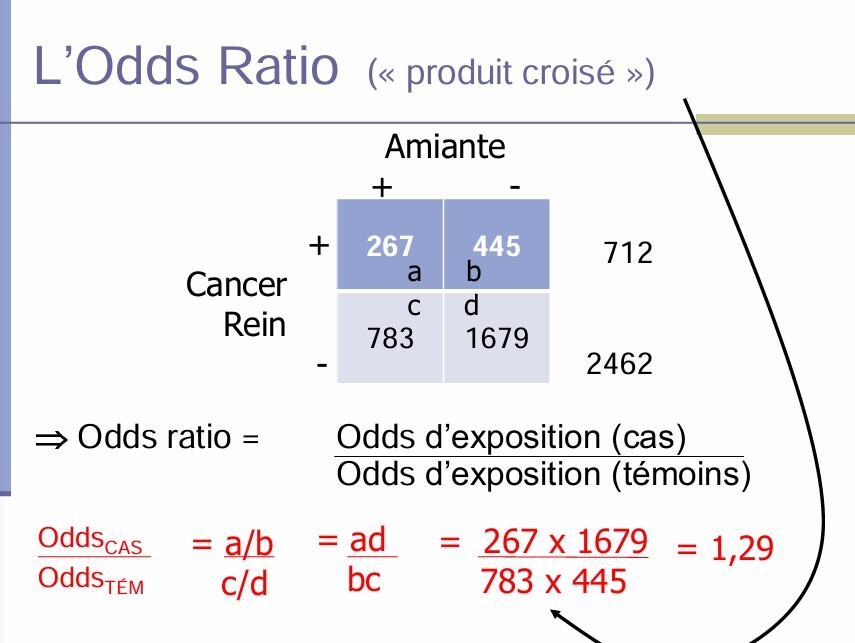 Odds ratio = odds d’exposition chez les cas / odds d’exposition chez les témoins